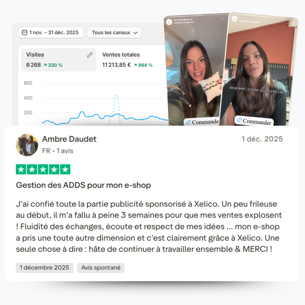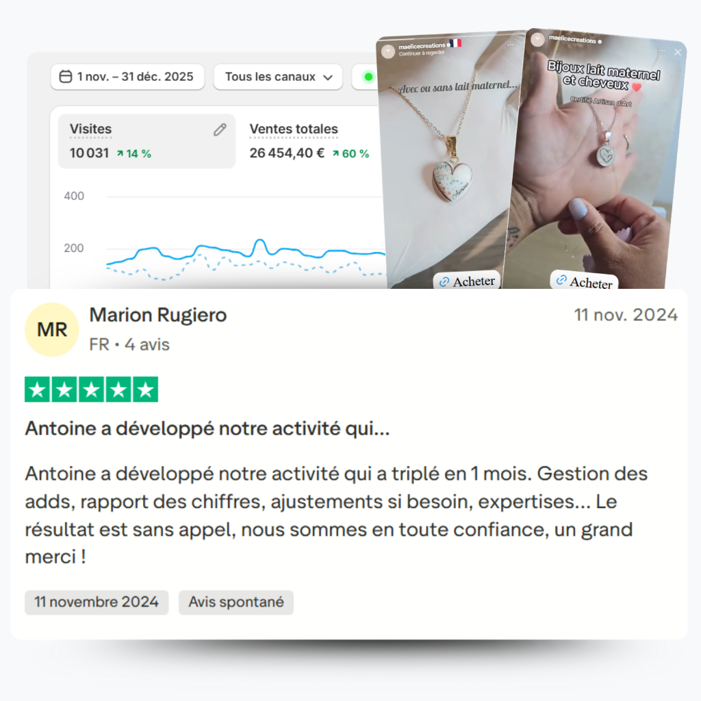 Audit de votre boutique, optimisation orientée conversion, tracking Meta, création des campagnes et production des publicités.